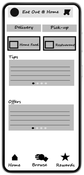 Design an app Eat Out @ Home that allows users to easily order fresh home-cooked food that can be delivered or picked up.