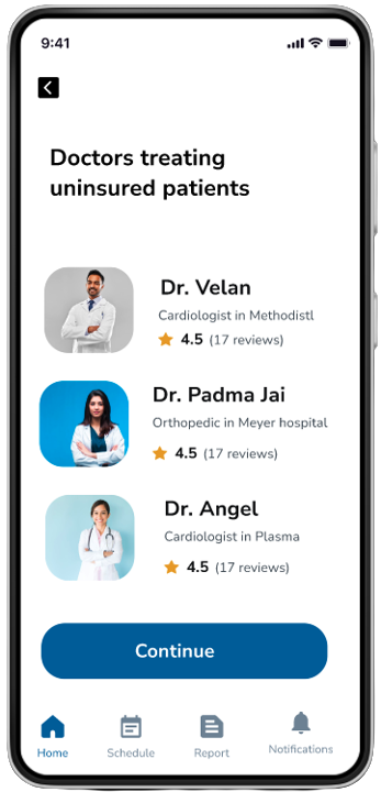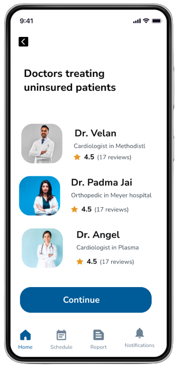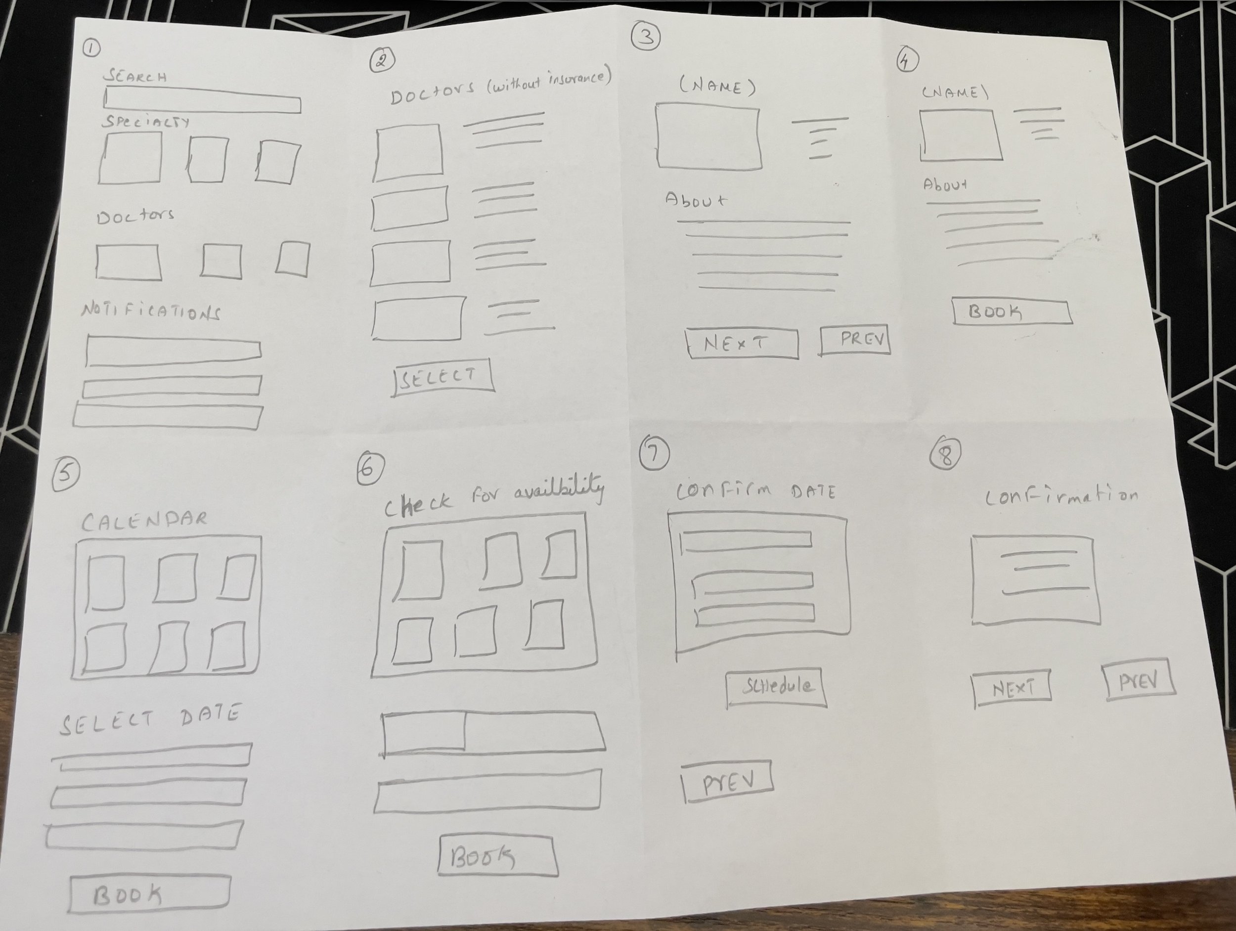 I used MediAid’s data on doctors treating uninsured at low cost to develop interview questions, which, were then used to conduct user interviews. Most interview participants reported feeling frustrated about the difficulties in booking an appointment with specialty doctors when they or their loved ones fell sick. The feedback received through the research made it very clear that the users would be open and happy if they had access to an easy-to-use tool that would help guide them in finding, and booking an appointment with doctors who would take in patients without insurance.