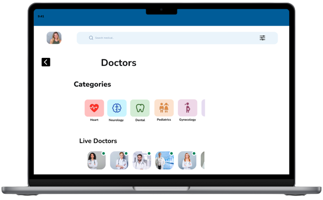 The home screen has search options for the users to type in the services or doctors they require. The middle screen has all other options and services that are available for the users to choose from.